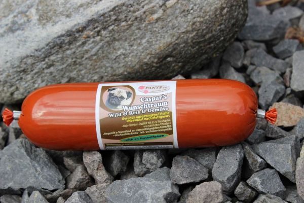 Da Caspars Wunschtraum eine glutenfreie Rezeptur ist, eignet sich auch diese Wurst ganz besonders für Hunde die Probleme mit Gluten haben. Dieses Gericht ist für alle ausgewachsenen Hunde als Alleinnahrung geeignet. Auch Ihr Welpe im Alter ab 3 Monaten darf die PANYS-Wurst auf 4-5 Mahlzeiten verteilt bekommen. Da Welpen während des Wachstums einen höheren Bedarf an Kohlenhydraten haben, sollten Sie auf alle Fälle noch Welpentrockenfutter zufüttern. Hergestellt werden die PANYS Würste in Deutschland nach Lebensmittelstandard. Rezeptur ohne zugesetzte künstliche Aroma- und Farbstoffe. Wir wünschen Ihrem Liebling guten Appetit! |