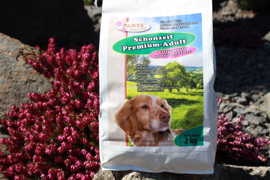 PANYS Schonzeit Premium-Adult kaltgepresst ist als Alleinnahrung für ausgewachsene Hunde aller Rassen mit reduziertem Energiebedarf, sowie für ältere Hunde zugelassen.
