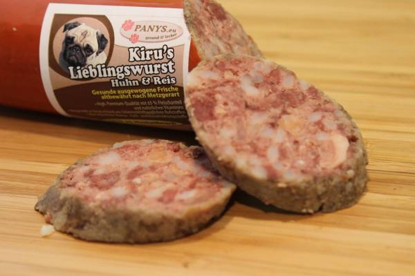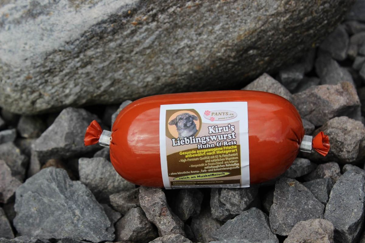 Speziell für glutenempfindliche Hunde haben wir auch hier eine glutenfreie Rezeptur. Die Kiru Wurst eignet sich besonders für Hunde die Probleme mit Gluten oder auch rotem Fleisch haben. Hergestellt in Deutschland nach Lebensmittelstandard. Dieses Gericht ist für alle ausgewachsenen Hunde als Alleinnahrung geeignet. Auch Ihr Welpe darf im Alter ab 3 Mon. die PANYS-Wurst auf 4-5 Mahlzeiten verteilt bekommen. Da Welpen allerdings während des Wachstums noch mehr Kohlenhydrate benötigen, sollten Sie noch glutenfreie Welpen-Trockennahrung zufüttern. Wir wünschen Ihrem Liebling guten Appetit!